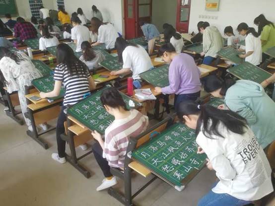 本次活动要求参赛者现场发挥,将指定内容先后以钢笔字、粉笔字和毛笔字的形式展现。活动现场,同学们个个满怀激情,胸有成竹,一挥而就。纷纷交上了自己满意的作品。“行云流水,落笔如云烟”的自信优雅的身影晕染出几缕水墨画的雅致,为此次活动增添了浓浓的文化韵味。参赛者的作品由评委老师现场一一点评打分,选手认真听取评委意见并虚心接受,纷纷表示会继续努力,争取以后的写字水平更上一层楼!在同学们的积极参与及工作人员的积极配合下,本次比赛取得圆满成功。