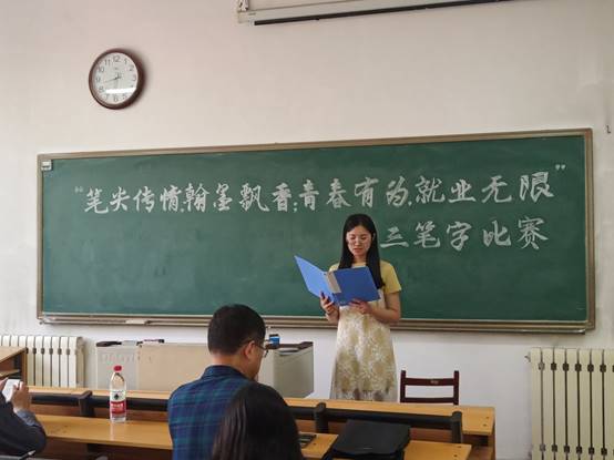 团委学生会特于5月19日在老文史楼228教室举办“笔尖传情,翰墨飘香;青春有为,就业无限”为主题的三笔字活动。出席本次活动的评委为张祥沛老师和郭永峰老师。