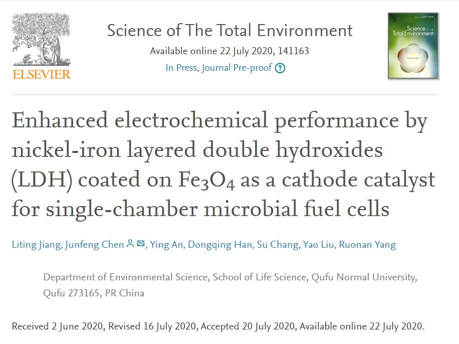 2017级环境科学班江丽婷、安莹、韩冬青、常素、刘瑶、杨若楠的研究论文(Liting Jiang, Junfeng Chen*, Ying An, Dongqing Han, Su Chang, Yao Liu, Ruonan Yang. Enhanced electrochemical performance by layered double hydroxides (LDH) of nickel-iron coated on Fe3O4 as cathode catalyst for single-chamber microbial fuel cell)。该论文以足球论坛