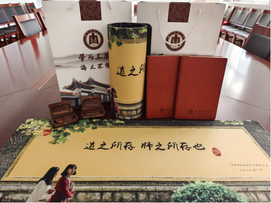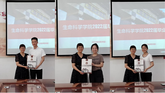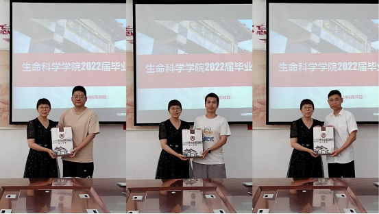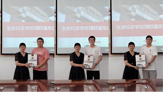 王仁君为参会的毕业生代表赠送毕业纪念礼物并合影留念。