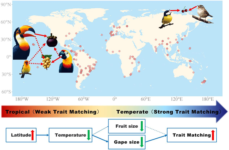 日前,易现峰教授团队在协同进化与适应性研究领域取得了重要突破,相关研究成果以“Global avian frugivore-fruit trait matching decreases towards the tropics”为题发表于国际顶级期刊《Global Change Biology》(原文链接://onlinelibrary.wiley.com/doi/10.1111/gcb.70180),这是曲阜师大首次作为第一通讯作者单位在该期刊上发表研究成果。《Global Change Biology》由Wiley-Blackwell Publishing Ltd出版,为生态环境领域具有广泛影响力的顶级期刊,专注于报道全球变化相关的创新性研究成果,最新影响因子(IF)为10.8,五年平均影响因子为13,被SCI数据库收录(中科院大类和小类双一区Top)。
