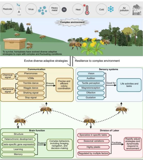 蜜蜂作为陆地生态系统的传粉枢纽,其生存状态对环境变动展现出极高的指示性。为应对复杂多变的环境和生存压力,该物种进化出了一系列精妙的适应性策略。揭示其生存机制,不仅有助于维护生态平衡,也为探索可持续发展路径提供了重要的研究支撑。然而,现有研究多局限于单一学科视角,对驱动其环境适应的内在“多维协同机制”尚缺乏系统性阐释。