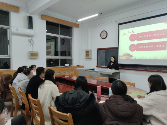 本次报告会是研究生党支部积极开展党员同志联系服务群众,以党建带团建的主题活动之一。王美云同志围绕“彰显青春力量 共绽师范风采”的活动主题,从以下两个方面做了主要演讲:第一、新时代青年一代的担当。王美云同志与大家分享了习近平总书记给青年学生的三封回信,提出作为新时代的青年,要担当时代责任,锤炼品德修为,练就过硬本领,最终成就一番事业。第二、研究生期间的主要任务。王美云同志针对学科教学专业的学习任务以及专业特点做主要发言,并对2020级学科教学专业全体研究生提出建议。最后,王美云同志以习近平总书记的两句话与大家共勉:“强者,总是从挫折中不断奋起、永不气馁;奋斗是青春最亮丽的底色”,并对2020级学科教学专业全体研究生表示衷心的祝愿。