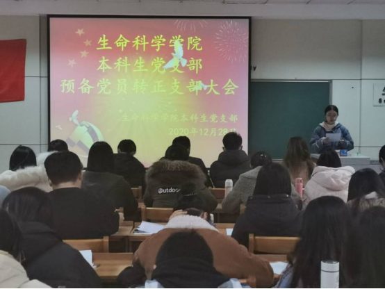 会议讨论、表决了袁晓涵、宋金铎等12名同志预备党员转正事宜。本科生支部书记刘文静首先介绍了以上12名同志的基本情况。依据党员发展工作流程,12名同志逐一宣读转正申请书,向大会汇报自己在预备期间的思想和学习情况;其入党介绍人分别对12位同志在一年预备期内的表现给予评价并发表意见;与会党员在此基础上充分讨论并进行无记名投票。根据投票结果,大会决定同意袁晓涵、宋金铎等12名同志按期转为中共正式党员。