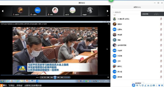 会议由党支部书记刘文静主持。首先,刘文静向大家介绍活动的主要内容。接着,由宣传委员杨申振领学习总书记关于学习党史国史的重要论述,引导全体党员深入学习党史。杨申振指出,党员应该更加注重对爱国主义事件的学习,从党史国史的学习中汲取奋进力量。随后,全体党员共同观看“习近平在党史学习教育动员大会上的讲话”等视频进行学习,汲取党和国家的历史经验。观看结束后,由党员代表分享个人自学党史国史的心得体会,通过交流探讨自己的亲身感触,表达自己关于学史担责的认识。