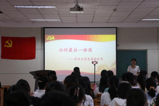 毕业生党员代表颜小涵、高博闻同志,预备党员代表华豫原同志,入党积极分子代表李睿同学,分别分享了自己的学习感悟。他们一致表示党和人民对大学生寄予无限期待,时代也赋予了大学生以光荣责任,新时代中国青年要听习近平总书记的教导,在投身党和人民的共同奋斗中创造更加美好之青春人生!此外,毕业生党员还表达了对新一批预备党员和入党积极分子的希望,能够蓬勃向上、积极进取,在党的领导下,严格要求自己,用自己的所学为社会做出贡献,实现自己的价值,发挥好自身的模范带头作用,将党的初心和使命一代代传承下去。
