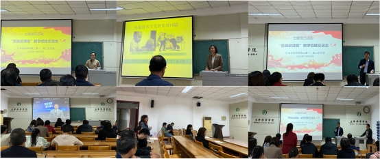 随后,刘柏玲、周晶、甘延东三位老师依次分享了自己在教师教学比赛和课堂思政中的成功经验,三位老师分别从教学理念、教学方式、教学能力等方面进行了讲解与分享,参与活动的同志们均表示受益匪浅、热情高涨,其中年轻教师代表郝婧、刘小妹针对自己在教学过程中的困惑等提出了相关问题并与三位老师进行了深入的交流与沟通。