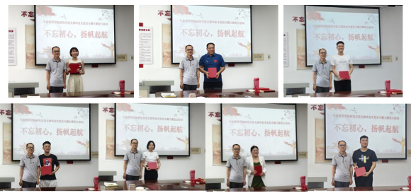 李志广为参会的毕业生代表颁发党支部精心准备的毕业礼物并合影留念。