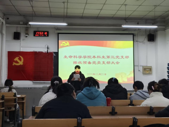 本科生第三党支部于2025年11月21日在生物楼317室召开党员大会,讨论接收中共预备党员事宜,支部全体党员参会。