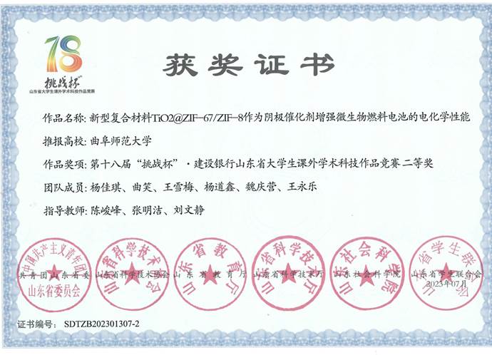 陈峻峰老师指导、杨佳琪同学带队的团队作品《新型复合材料TiO2@ZIF-67/ZIF-8作为阴极催化剂增强微生物燃料电池的电化学性能》荣获二等奖。