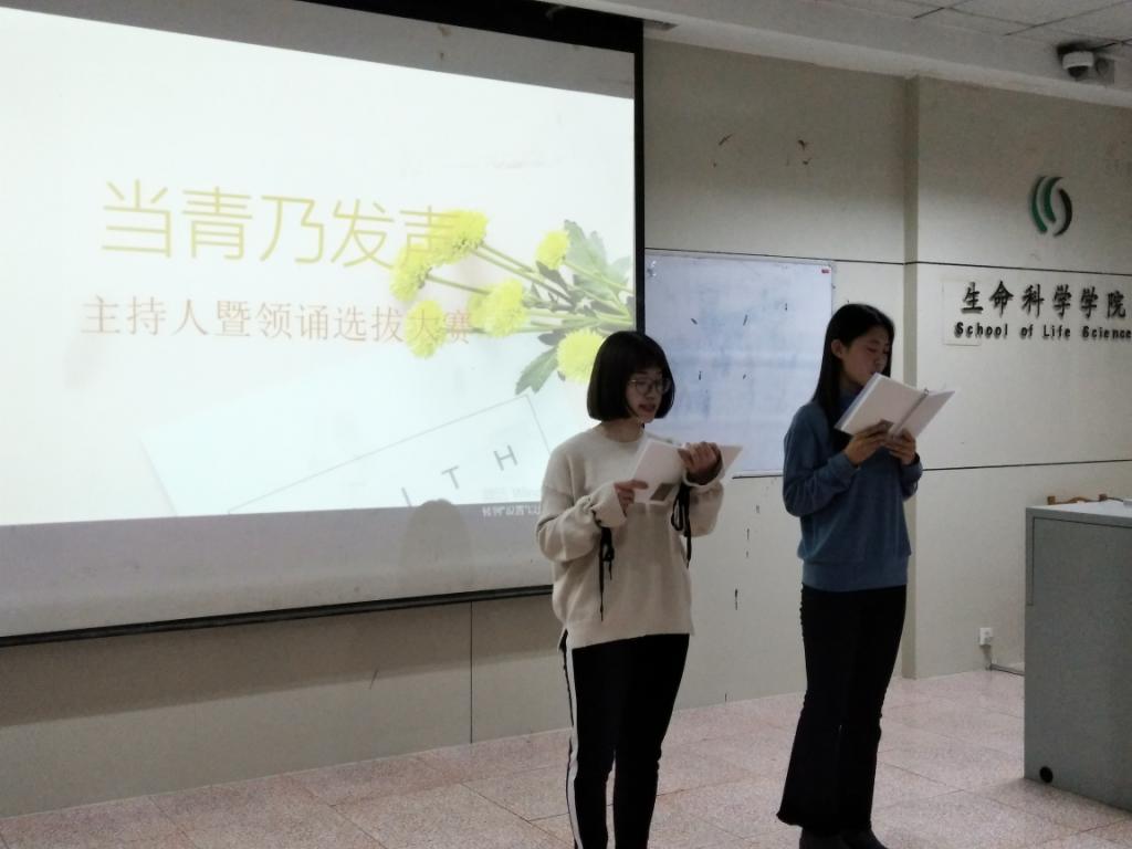 团委学生会于3月18日在生物楼二楼多媒体教室举办“当青乃发声”主持人暨领诵选拔比赛。本次活动邀请到学生会事务统筹中心主任马得耀、文艺部部长商红娜、宣传部部长赵熙宇、学习部部长耿昕以及优秀领诵李晨、吴云潇。