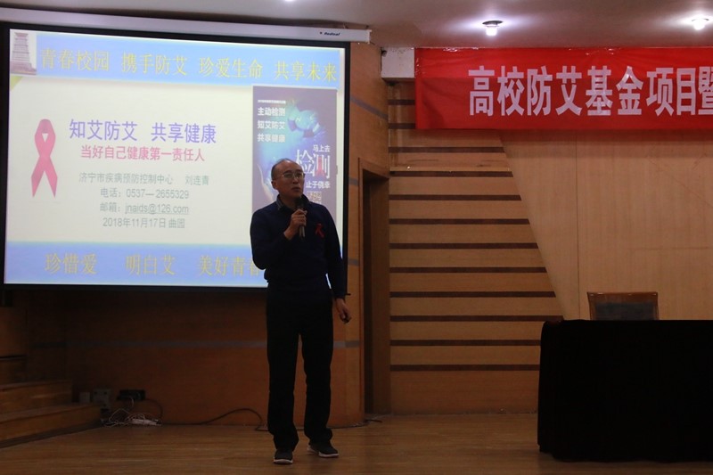 仪式结束后,开始了本次活动的第一项内容,由济宁市疾病济宁市疾病预防控制中心艾滋病防治科科长刘连青教授进行宣教、培训第一课,通过幻灯片向大家认真仔细讲解艾滋病防治知识等。由曲阜市疾病预防控制中心艾防结防科科长颜丙光老师进行第二课,讲解结核病防治知识等。讲解过程中同学们认真听,认真记,充分了解和掌握了防艾知识。最后,进行防艾知识有奖竞猜环节,及时考查知识的掌握情况。现场气氛十分活跃。
