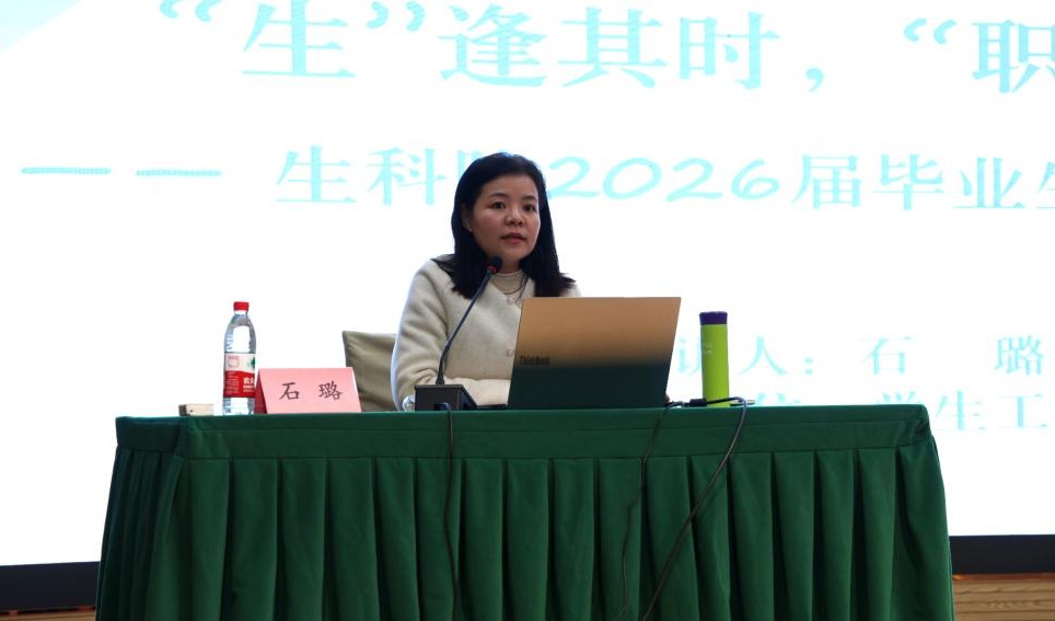 石璐结合“十四五”与“十五五”规划中生物领域的国家政策导向,以详实的数据和案例分析了2026年就业态势。她建议同学们树立正确就业观,将求职作为重要任务认真准备,从目标定位、信息筛选到简历、面试等环节全面提升实战能力。
