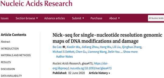 第一篇论文题为“Nick-seq for single-nucleotide resolution genomic maps of DNA modifications and damage” (doi: 10.1093/nar/gkaa473),发表在《Nucleic Acids Research》上,曹博教授为第一作者与通讯作者,足球论坛