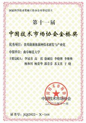 李冠喜教授领衔的食用菌液体菌种研发团队,与山东省农业技术推广中心、连云港国鑫食用菌成套设备有限公司等多家单位联合攻关完成的“食用菌液体菌种技术研发与产业化”项目荣获第十一届中国技术市场协会金桥奖。
