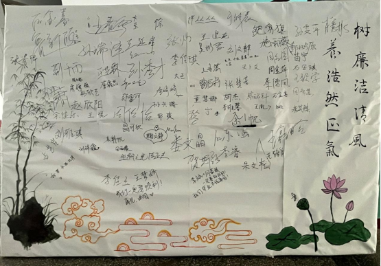 团委开展“养浩然正气,树廉洁清风”签名承诺活动。展板设计以“植物话廉”为理念,以莲喻廉、比德于竹,将最具廉洁品性的植物与传统文化的廉洁元素相结合,传承千年廉洁精神,让廉洁文化在师生心中落地生根、开花结果。