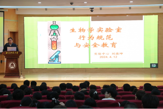 同学们的实验室安全意识,规范实验室行为。4月12日晚上,特邀实验室刘德坤老师在孔子会堂开展“生物学实验室行为规范与安全教育”报告。