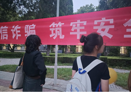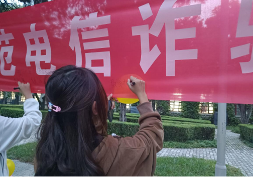此外,志愿者为学生们讲述了什么是帮信罪、帮信罪的危害、如何防范帮信罪等相关知识,明确告知学生出租、出借、出售、购买电话卡是违法犯罪行为,并通过现场提问,与学生们展开互动,有针对性的向广大师生讲述了冒充班级家长群进行收费的诈骗案例、虚拟游戏充值类、刷单返利类、虚假征信类、虚假网络贷款类等常见的电信网络诈骗的手段、防范技巧以及各类诈骗套路和防范举措;同时提醒在校师生要时刻保护好个人信息,提高自身的防范意识,切勿因蝇头小利落入犯罪嫌疑人的诈骗陷阱。同学们自发在横幅上写下被诈骗的经过或者防诈骗的建议,通过这种方式提醒自己也警醒他人,并郑重签名承诺,绝不触碰诈骗,绝对打击诈骗,共同助力“天下无骗”。