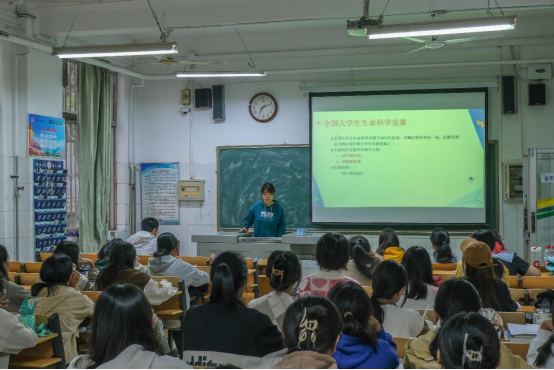 学生会科技创新部部长从“双创教育背景与意义”“双创品牌活动简介”“双创教育激励政策”等三个方面进行讲解。随后介绍了生科院学生可参加的A类、B类学科竞赛项目和足球论坛