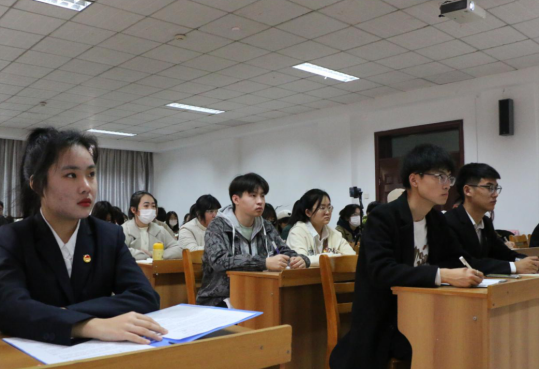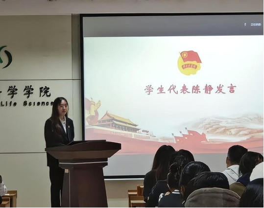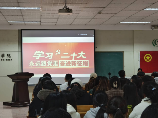 团委组织部副部长杨羽、党建学生工作部副部长陈静作为学生代表分别进行交流发言,分享学习心得。杨羽从学习党的二十大精神、领会党的二十大的重大意义两个方面进行了交流分享,强调了中国青年坚定不移听党话、跟党走的必要性,并号召大家作为肩负人民期待和时代重任的青年,应主动将个人理想行动融汇在党和人民的伟大事业中,以理论武装筑牢信仰根基,坚定为理想实施奋斗的信念。陈静从在十年伟大变革中汲取精神力量、投入中国式现代化伟大事业、争当担当民族复兴重任的新时代好青年三个方面分享了心得感悟,表达了自己作为青年一代,争做走在时代前列的奋进者、开拓者、奉献者的决心。