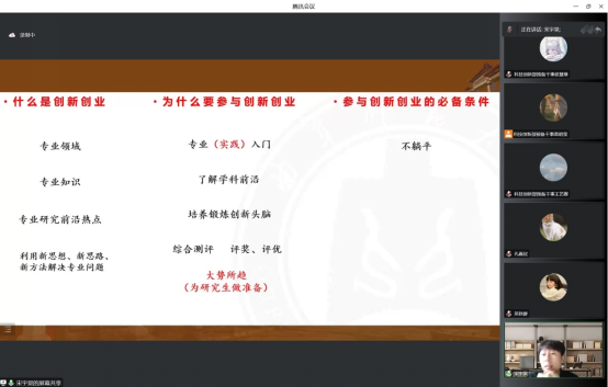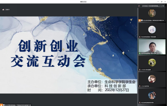 会议邀请了国家级大学生创新创业训练计划项目的指导老师宋宇昊老师,参与硕师计划保研的孔嘉欣师姐,获得全国大学生生命科学竞赛国家级一等奖的吴轶群师姐。本次创新创业经验交流互动会在线上使用腾讯会议举办。