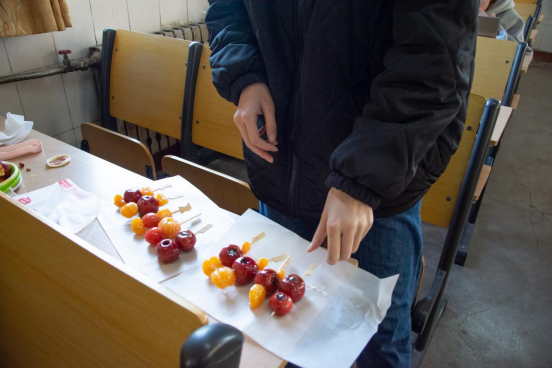 同学们分为两组,A组成员发挥合作精神,现场积极查找资料,团结协作,努力克服了最困难的熬糖环节。B组成员推陈出新,突破传统材料的限制,使用多种非传统材料,制作出各类新颖美味的冰糖葫芦。在A、B两组同学的合作下,同学们为冰糖葫芦蘸糖,待糖衣冷却后,美味的冰糖葫芦制作完成。