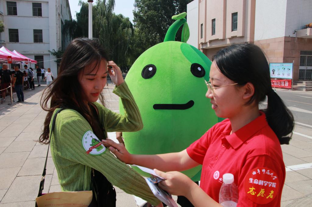 环境科学专业的李腾洲同学在佩戴上标识贴后,又使劲按了按,是珍视也是决心。