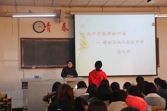 三位中学老师分别向学生传授教学经验,从授课方式、授课方法、授课重点等方面进行讲述,针对如何进行启发教学,作为新教师怎样将教案做到融会贯通以及怎样才能持续教学热情等问题做出了回答。随后,进入答疑环节,学生们踊跃参与,老师们幽默风趣地解答,现场气氛热烈,其乐融融,学生们收获满满。