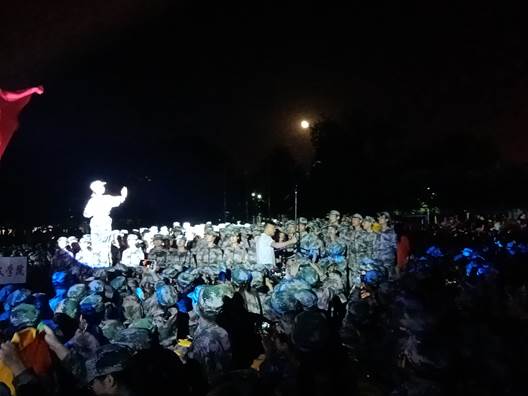 学子高昂地热情向上、浓郁的爱国情感与强军梦想,也表达着同学们对祖国母亲的热爱与属于他们的自信和活力。“准备好了吗士兵兄弟们,当那一天真的来临,放心吧祖国放心吧亲人,为了胜利我要勇敢前进……”他们声声激昂,字字铿锵,歌颂了英雄战士们不畏艰难、保家卫国的情怀,展现了这十天军训的丰硕成果,赢得了台下热烈的掌声与欢呼声。