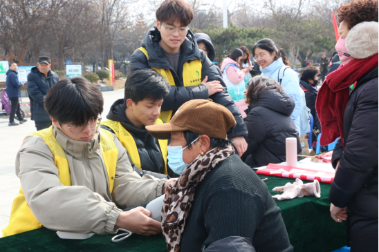 活动当天,曲阜市沂河公园广场人头攒动,气氛热烈。志愿者服务队的同学们早早来到现场,搭建服务台、准备仪器设备,为市民提供义务量血压服务。志愿者们身着统一服装,面带微笑,耐心细致地为每一位前来咨询的市民测量血压,并根据测量结果给出健康建议。