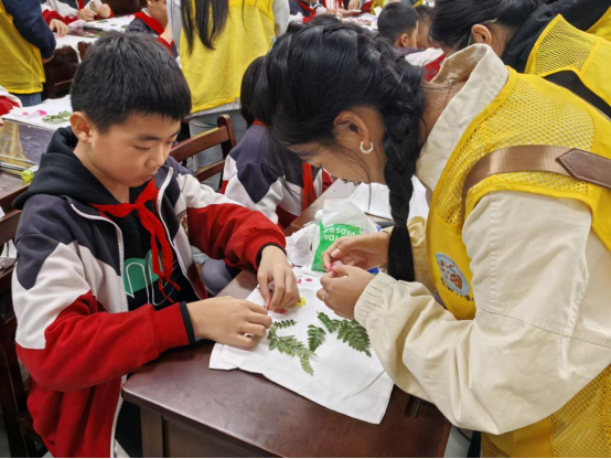 活动中,志愿者们首先为孩子们讲解植物拓印的基本步骤与技巧,现场演示帆布包制作流程。随后,在志愿者的协助下,小朋友们亲手挑选植物、设计构图,完成一个个独具特色的拓印作品。志愿者们还结合专业背景,生动介绍各类植物的形态特征与生长习性,将知识讲解融入动手实践。