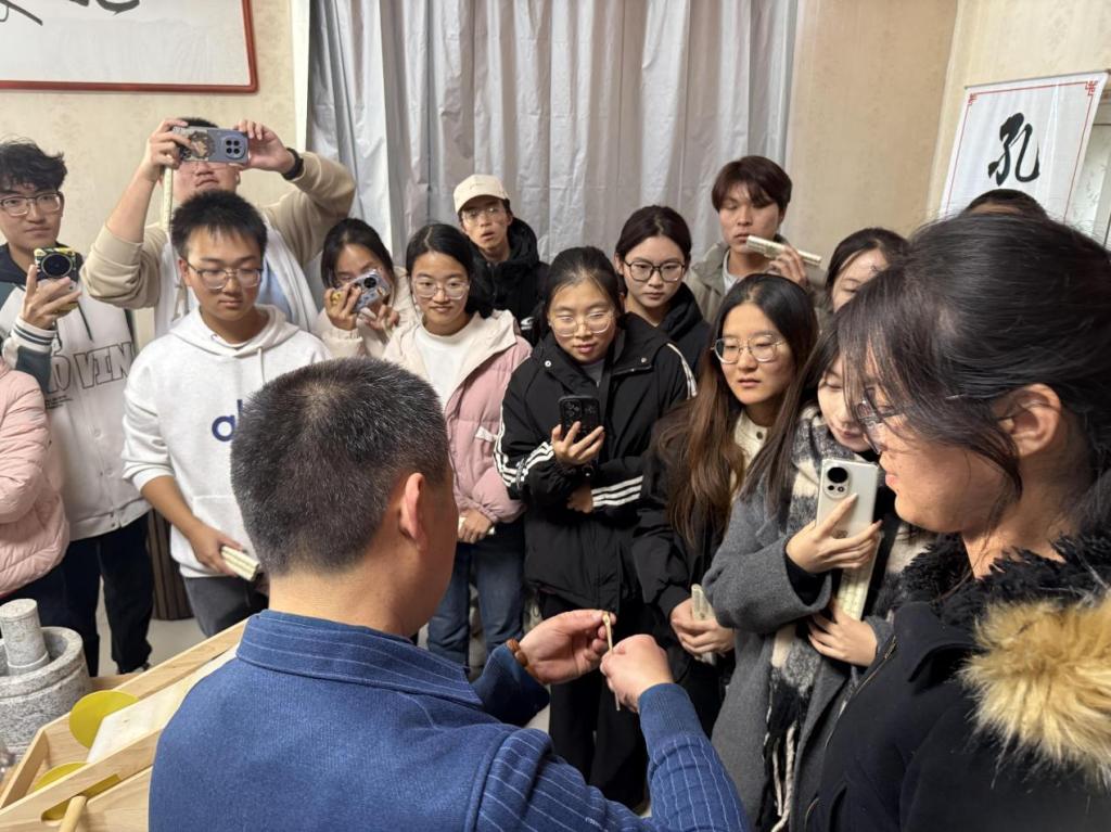 实操环节,同学们先学辨识优质艾草(看青褐、闻清香、摸柔软),再练艾灸穴位定位、持艾角度等技巧,两两结对练习,传承人巡回指导,解答艾灸常见疑问。现场还体验艾柱制作,亲手填充艾绒。活动最后,传承人向学子赠艾柱,鼓励理论联系实际。