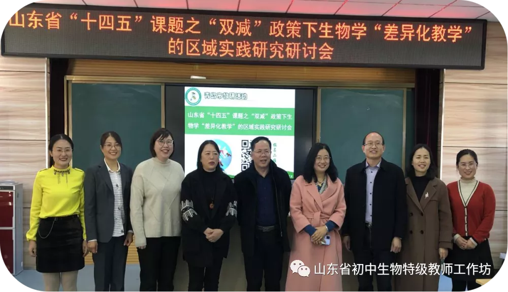 “双减”政策下,如何尊重学生的差异,构建愉悦高效的生命课堂,让每位学生像花儿一样绽放,是摆在每位生物教师面前的课题。2021年12月1日,山东省“十四五”课题之“双减”政策下生物学“差异化教学”的区域实践研究研讨会暨山东省初中生物学特级教师工作坊青岛群组举行线上听评课活动在青岛胶州市第二初级实验中学举行。本次活动采用线上和线下同步直播的方式进行,青岛市教科院张玉坤主任、市南区教育研究指导中心关茜主任、市北区生物教研员李琛琛老师和胶州市初中生物教师参与线下活动,初中生物学特级教师工作坊青岛群组全体教师同步参与线上直播,胶州市初中生物教研员张萍老师主持本次研讨活动。