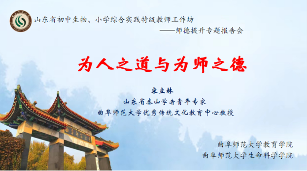 优秀传统文化教育中心教授宋立林作题为《为人之道与为师之德》的会议报告。山东省初中生物、小学综合实践特级教师工作坊全体成员及足球论坛