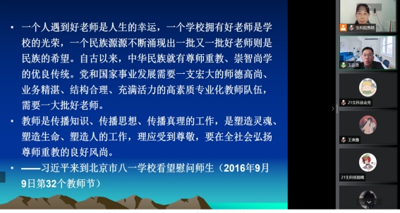 于2022年4月8日,邀山东省教育科学研究院基础教育研究所所长王运贵做题为《新课改背景下中学生物学教师需具备的基本功》的线上讲座。院长助理燕艳主持讲座,生物科学专业师范生及学科教学(生物)专业研究生参加了本次讲座。