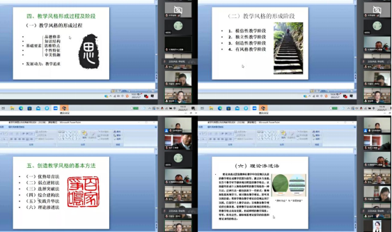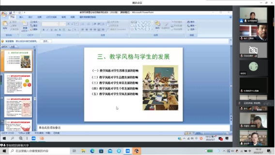 就教学风格的教育价值,李教授从对学生思维、品德、审美、个性、学风五个方面发展的影响入手,展开了详尽的讲解,并且强调教师的独特影响力与教师独特的风格紧密联系。通过图文并茂的展示,使参会教师对教学风格的价值有了全新的认识,对教学风格在教学实践中进行了新的定位。